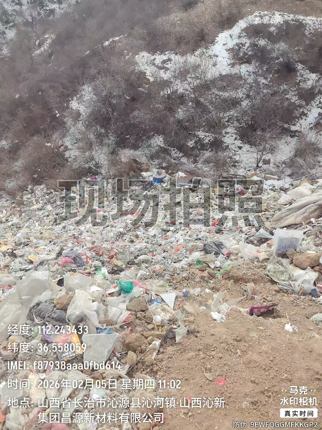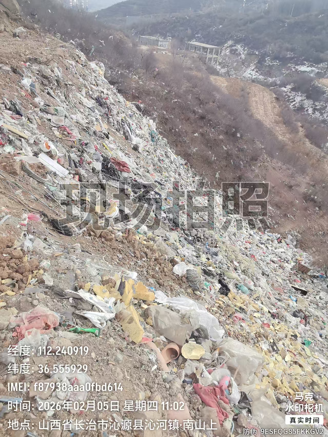 照片上清晰标注的时间为2026年2月5日11:02,经纬度、IMEI码及防伪水印等信息完整,明确指向拍摄地点为山西省长治市沁源县沁河镇南山,这一由村民实拍的画面,成为当地垃圾治理缺位的铁证。