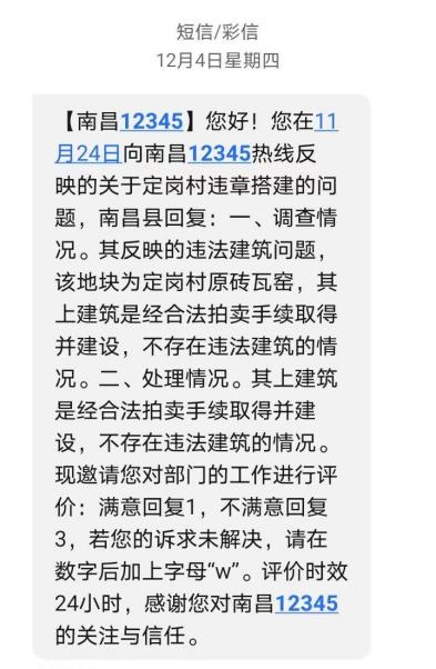 12月4日,南昌县政府通过短信向李先生作出回复,“该地块为定岗村原砖瓦窑,其上建筑经合法拍卖手续取得并建设,不存在违法建筑的情况。”
