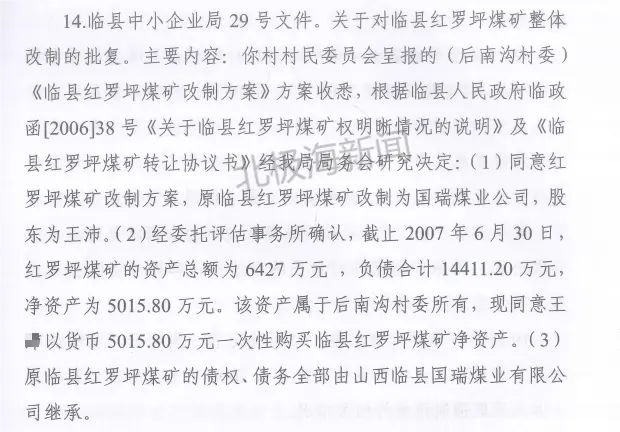 “特别需要说明的是,在临县中小企业局关于红罗坪煤矿整体改制的批复中,明确表示煤矿净资产(5015.80万元)属于后南沟村委会所有,现同意王某以货币5015.80万元一次性购买红罗坪煤矿净资产。但实际上,村委会和村民从未见到过这笔钱。巧合的是,国瑞煤业的注册资本恰好为5015万元。”闫飞说。