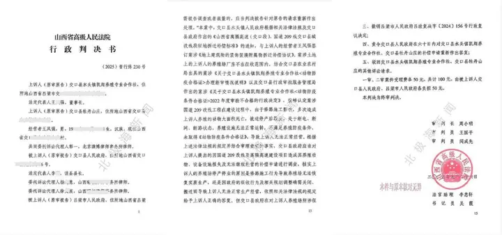 2025年1月,养殖社与牡丹山庄因不服交口县人民政府的补偿申请答复、吕梁市人民政府的行政复议决定,以及晋中市中级人民法院(2024)晋07行初95号行政判决,向山西省高级人民法院提起上诉。山西省高级人民法院于2025年6月作出终审判决:判定撤销山西省晋中市中级人民法院(2024)晋07行初95号行政判决;撤销交口县人民政府作出的《补偿申请答复书》;撤销吕梁市人民政府吕政复决字[2024]156号行政复议决定;并责令交口县政府于同年11月下旬前完成补偿事宜的处理工作。