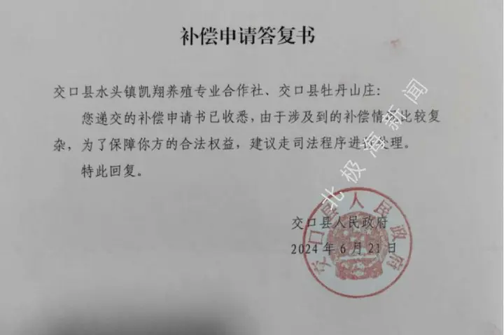 (图为交口县人民政府出具的《补偿申请答复书》)