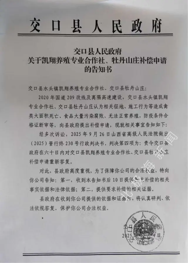 王某强向北极海新闻表示,该项目已累计投入超500万元,全村八百余名村民持有36%的股份,而每年的保底分红早已无法兑现。山西省高级人民法院作出判决后,交口县人民政府于2025年12月4日向他下发告知书,要求其“提供要求补偿的相关事实依据和法律依据”以及“提供要求补偿的相关证据”。