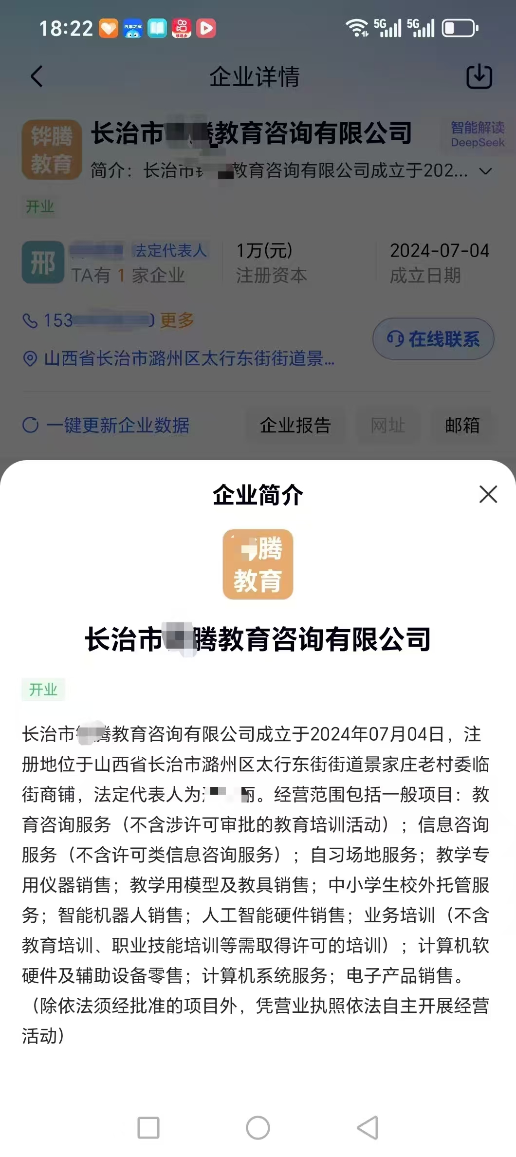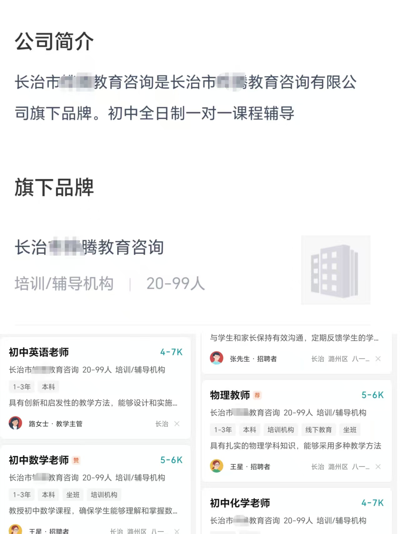 某腾教育咨询有限公司注册于潞州区太行东街街道景家庄原村委,公开信息显示其营业执照核定经营范围仅包含“教育咨询、自习场地服务、中小学生校外托管等”,无任何学科类培训相关资质。