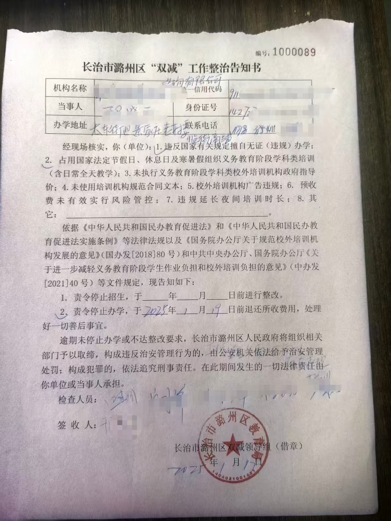 事件曝光后,潞州区教育局回应称已介入调查,并向某腾教育开具“双减”工作整治告知书。通知书显示,日期填写存在明显错误,开具日期与实际时间不符。